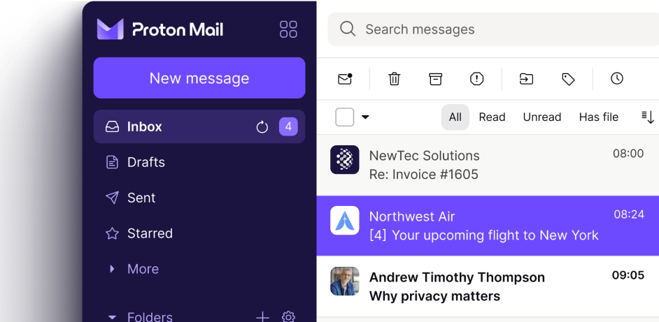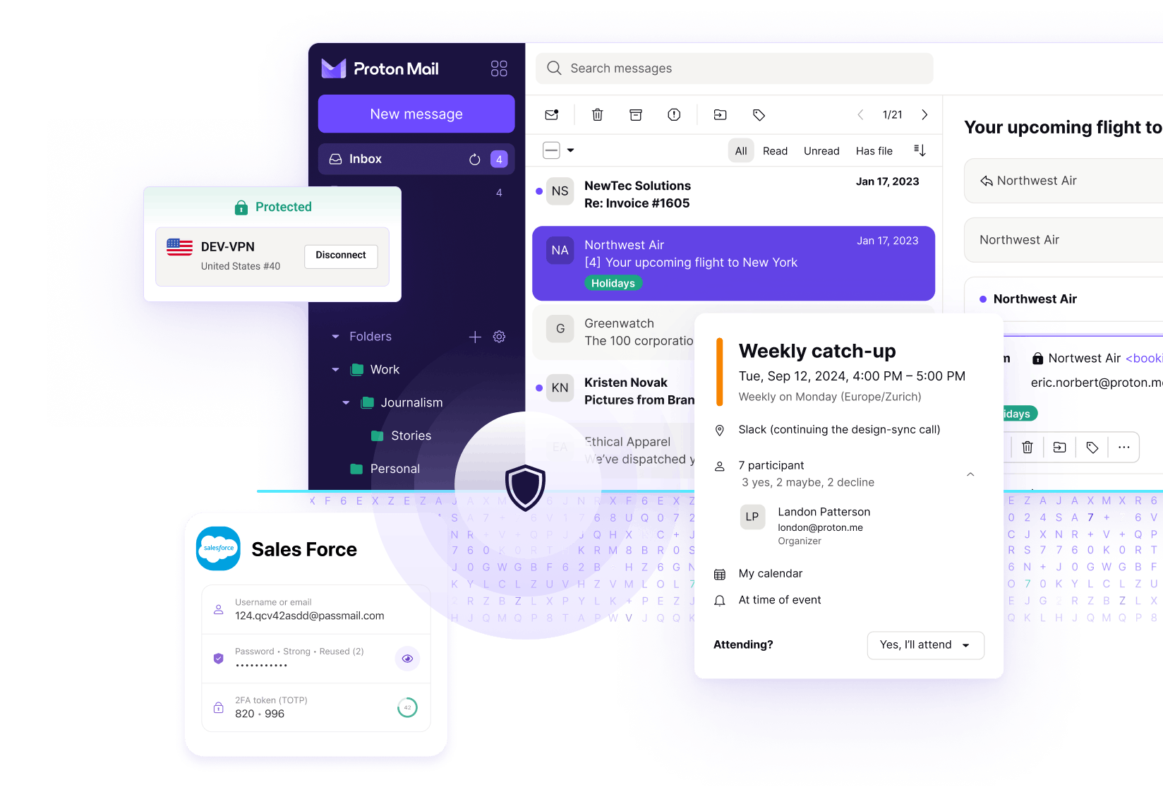 O Proton usa criptografia de ponta a ponta por padrão para proteger e-mails, eventos de calendário, armazenamento em nuvem e muito mais.